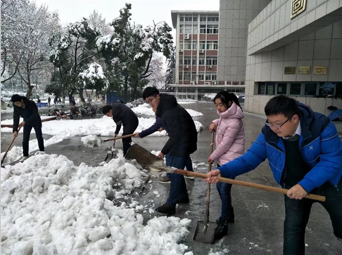 1月3日,合肥迎来2018年的第一场雪,厚厚的白雪覆盖了整个校园,大雪带来清新空气与美景的同时,也使道路、树木积雪严重,给广大师生的出行带来极大不便。校领导对雨雪、冰冻天气安全防范工作做出部署,学校相关部门迅速行动保障校园安全,于此同时全校党员干部、师生志愿者等也自发加入到清扫校园积雪的行列中。