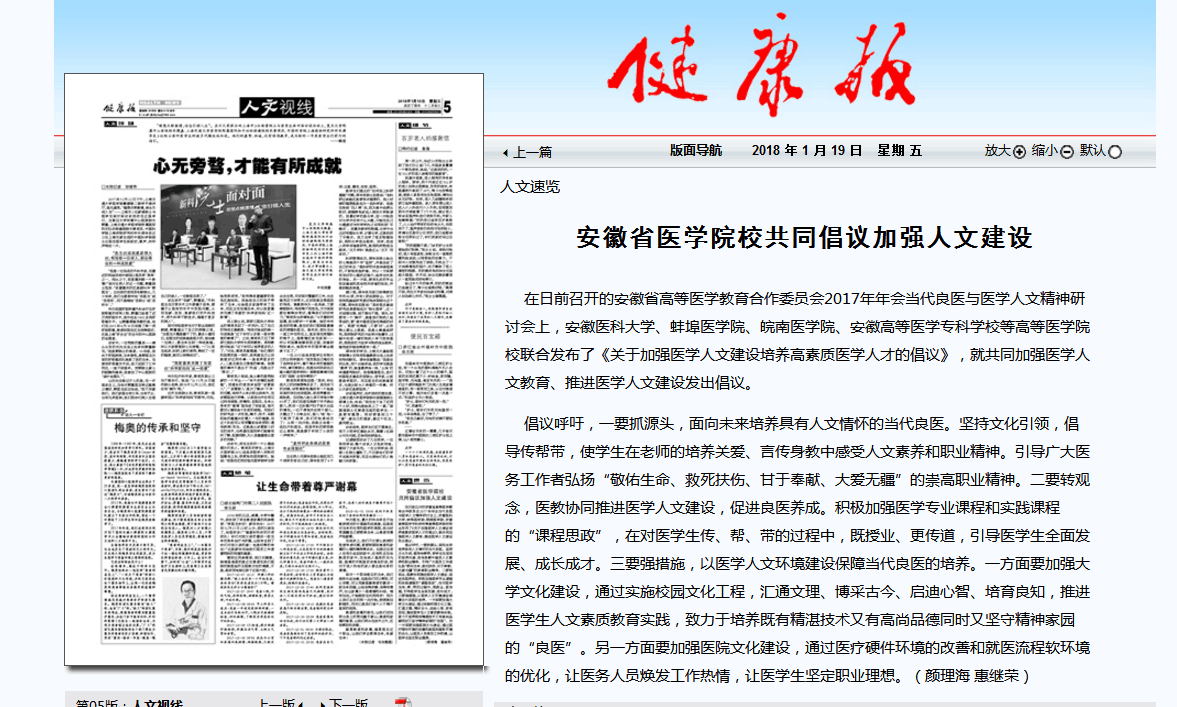 倡议呼吁,一要抓源头,面向未来培养具有人文情怀的当代良医。坚持文化引领,倡导传帮带,使学生在老师的培养关爱、言传身教中感受人文素养和职业精神。引导广大医务工作者弘扬“敬佑生命、救死扶伤、甘于奉献、大爱无疆”的崇高职业精神。二要转观念,医教协同推进医学人文建设,促进良医养成。积极加强医学专业课程和实践课程的“课程思政”,在对医学生传、帮、带的过程中,既授业、更传道,引导医学生全面发展、成长成才。三要强措施,以医学人文环境建设保障当代良医的培养。一方面要加强大学文化建设,通过实施校园文化工程,汇通文理、博采古今、启迪心智、培育良知,推进医学生人文素质教育实践,致力于培养既有精湛技术又有高尚品德同时又坚守精神家园的“良医”。另一方面要加强医院文化建设,通过医疗硬件环境的改善和就医流程软环境的优化,让医务人员焕发工作热情,让医学生坚定职业理想。(颜理海 惠继荣)