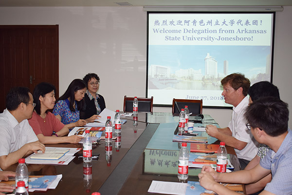 6月27日,美国阿肯色州立大学中国项目部负责人约翰·佩特(John Pate)一行来我校访问。校长曹云霞亲切会见了来宾并与他们进行了友好会谈,双方就开展联合培养人才开展了深入交流。