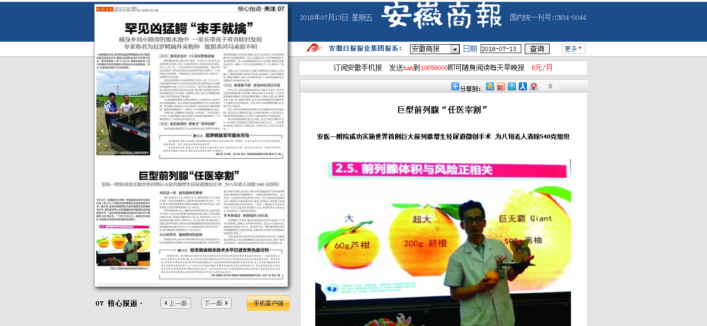 安医一附院成功实施世界首例巨大前列腺增生经尿道微创手术 为八旬老人清除540克组织
