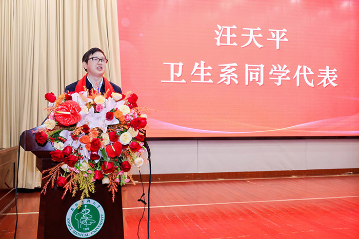 医学系同学代表凌至培、方志斌,卫生系同学代表汪天平,师资班同学代表管向东,上海同学代表盛畅以及回国同学代表郑颂国分别发言,一致表达了对“安医人”身份的自豪,对母校快速发展的无比振奋,对校友工作的切身感动和对昔日老师教诲的铭记于心。凌至培用一组照片展示了自己与国家发展高度契合的成长经历,表达了对母校的感念;方志斌感谢母校对本次大会的高度重视和大力支持,向母校培养表示感激,为校友们在各自领域绽放光彩感到自豪;汪天平结合亲身经历回顾了40多年珍贵的校园情、师生情、同窗情;管向东重温了校友们在战“疫期间团结一心、互相支持的感人故事;盛畅与母校、师友再度相逢倍感喜悦,表达了美好的祝福之意;郑颂国讲述了充满温暖和力量的归国历程,表示将始终不渝坚守初心,继续为健康卫生事业贡献智慧和力量。