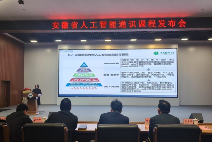 1月23日上午,安徽省教育厅举行人工智能通识课程发布会。我校李小虎、赵梅、邓雪飞三位教师凭借深厚的专业素养和丰富的教学经验,精心编写了该课程 “AI+医学” 部分,此课程将作为全省高校人工智能通识课程,在全省范围内高校推广使用。