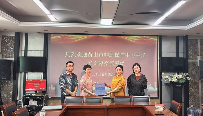 讲座结束后,方文婷与学院美育教师就徽州民歌传承保护、非遗进校园、民歌数字化推广等问题展开交流,就校地合作达成初步合作意向,并向学院赠送了黄山非遗保护中心编纂的非遗图典。(医学人文学院 李红)