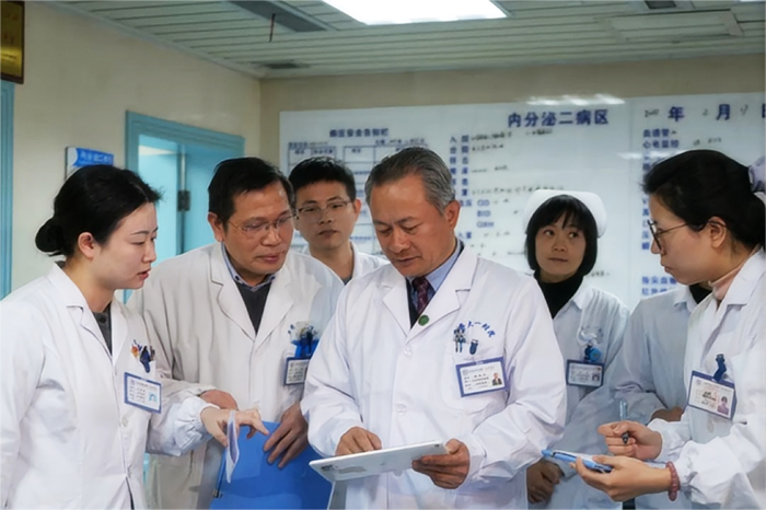 2025年2月,翁建平(右三)带领团队研讨诊疗方案。(图片由受访者提供)