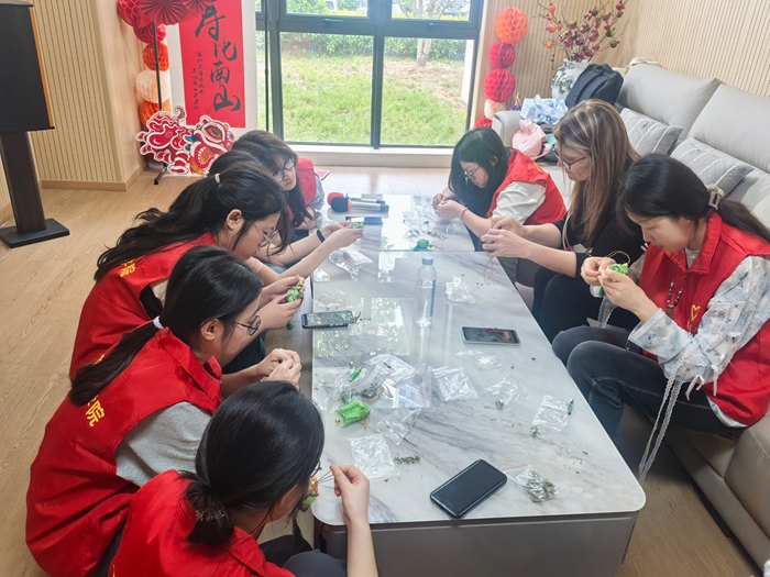 活动中,学生志愿者围绕防暑降温、饮食健康等内容开展健康宣讲,帮助老人科学应对夏季高温。瑞贝卡和学生一同为老人们制作端午香囊和漆扇,在交流与互动中感受非遗文化的魅力。瑞贝卡在学生协助下了解了养老院日常运作,并与老人们积极互动,表达节日祝福,为活动增添了一抹温馨的“国际色彩”。