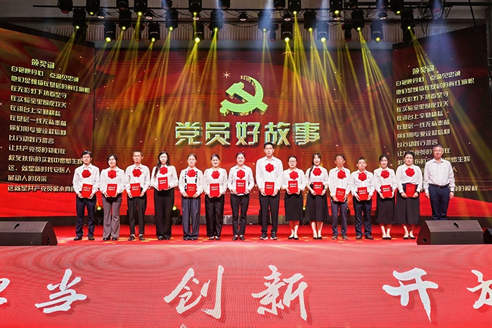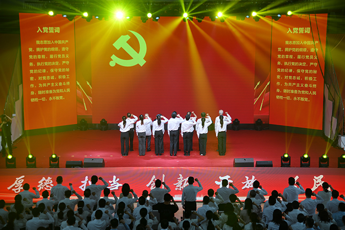 大会还举行了 “光荣在党 50 年”纪念章颁发仪式。王琦为老党员代表颁发纪念章,新党员代表向老党员献花,老党员为新党员佩戴党员徽章,新老党员共同重温入党誓词,这一刻,是跨越半世纪的信仰接力。