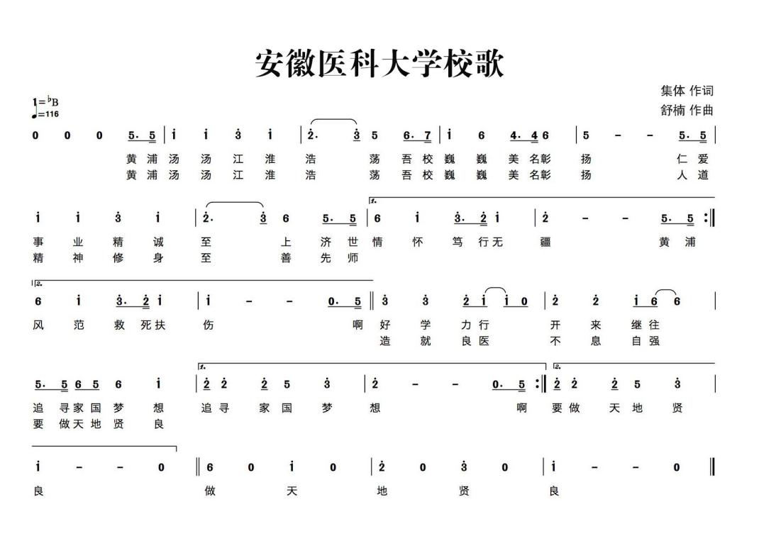 廿世之初,国难当头;科学民主,救国大纛。一九二六,黄浦江泣,腥风血雨,东南面世。先贤本以医学救国为初衷,师生更将民族富强为要旨:抗日前线,勇担救护;力反内战,呼民迎熙。光我中华,舍己张义;荜路蓝缕,矢志不移。一九四九响应号召举校迁安徽怀远,支援内地,为民解忧,由私改公,喜获新生。一九五二再迁合肥并更名安徽医学院,如沐春风,师生发愤,救死扶伤,华东驰名。一九八五又更今名,恰逢盛世,迅速崛起。桃李缤纷,手巧心懿。治病防控,报民所期。尤喜本世纪,中天朗日,跨越提速。部分成果,领先国际。科学发展,寰宇称奇。